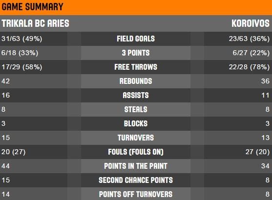 Κόροιβος:Ντέιβις 30(4/4β., 7/11διπ., 4/10τρ., 10ριμπ.), Πουλιανίτης, Χριστοδούλου, Χάρντινγκ 12(8/10β., 2/4διπ., 0/3τρ., 9ριμπ.), Χαριτόπουλος 20(6/6β., 4/6διπ., 2/4τρ.), Τρότερ 4, Γεωργάκης, Σλαφτσάκης 2, Βασιλόπουλος 1, Κάουνσιλ 5.