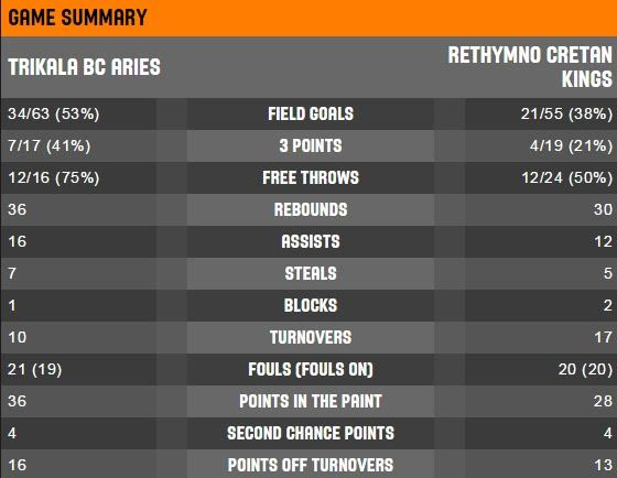 Τρίκαλα: Σοκό 22 (3), Τζόουνς 4, Βίλχαλμσον 8, Καλλές 2, Ρόμπινσον 15 (3), Κάντουγκαν 14, Τσιλουλής, Τσιάρας, Καλογιαννίδης, Μπράουν 20 (1), Βαρυτιμιάδης.