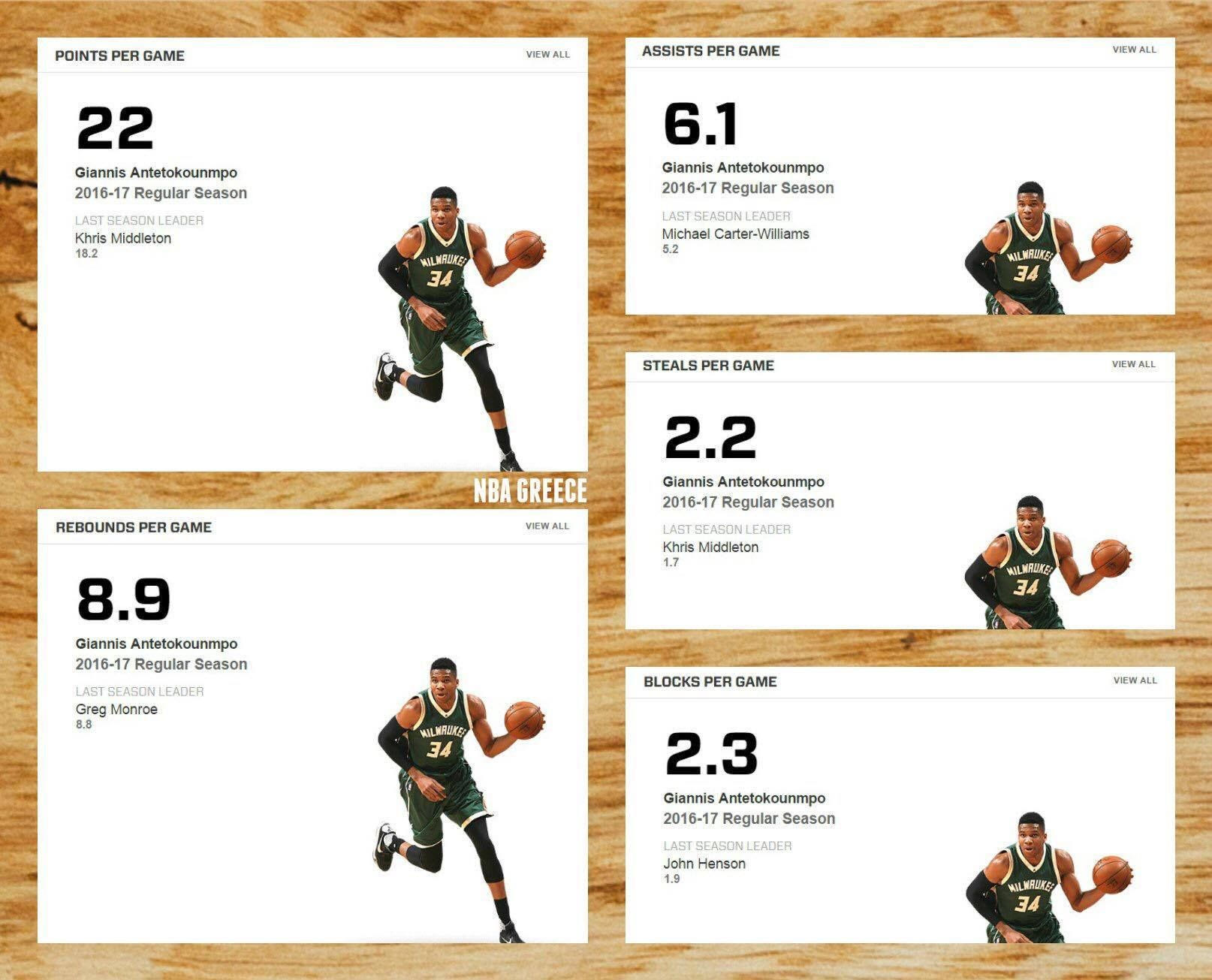 Πλέον, ο Αντετοκούνμπο είναι ο πρώτος σκόρερ, ο πρώτος ριμπάουντερ, ο πρώτος πασέρ, ο πρώτος κλέφτης και ο πρώτος μπλοκέρ των Μιλγουόκι Μπακς. Πρώτος στις πέντε βασικές στατιστικές κατηγορίες και αν συνεχίσει έτσι τότε δεν χάνει τη συμμετοχή στο All Star Game!