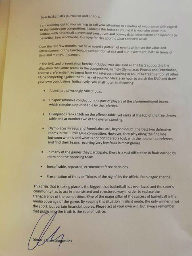 “Θέλω να σας επιστήσω την προσοχή σε ένα ζήτημα μεγάλης σημασίας για την Euroleague. Απευθύνω σε σας αυτή την επιστολή, καθώς είσαστε εσείς αυτοί που έρχεστε σε επαφή με τους παίκτες και τους παράγοντες και μεταδίδετε δεδομένα, πληροφορίες και απόψεις στους φίλους του μπάσκετ παγκοσμίως. Η αγάπη μας για το άθλημα είναι αυτό που μας ενώνει όλους.