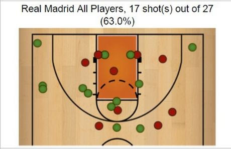Στο πρώτο ημίχρονο η Ρεάλ έχοντας διαβάσει την άμυνα του Ολυμπιακού πήρε κυρίως σουτ από μέση απόσταση και κράτησε το σκορ της ψηλά. Αυτό φαίνεται από το γράφημα για το τί έδωσαν οι ερυθρόλευκοι στους γηπεδούχους. Οι 10 από τους 42 πόντους της Ρεάλ ήρθαν όπως βλέπετε από τους πράσινους κύκλους από σουτ μέσης απόστασης.