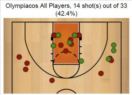 Ο Ολυμπιακός είχε ισορροπία στο σκοράρισμα στο πρώτο ημίχρονο πηγαίνοντας πολύ στην ρακέτα. Μόλις ένα σουτ επιχειρήθηκε από μέση απόσταση και άλλα 10 τρίποντα, με τα εύστοχα να έρχονται από την δεξιά πλευρά.