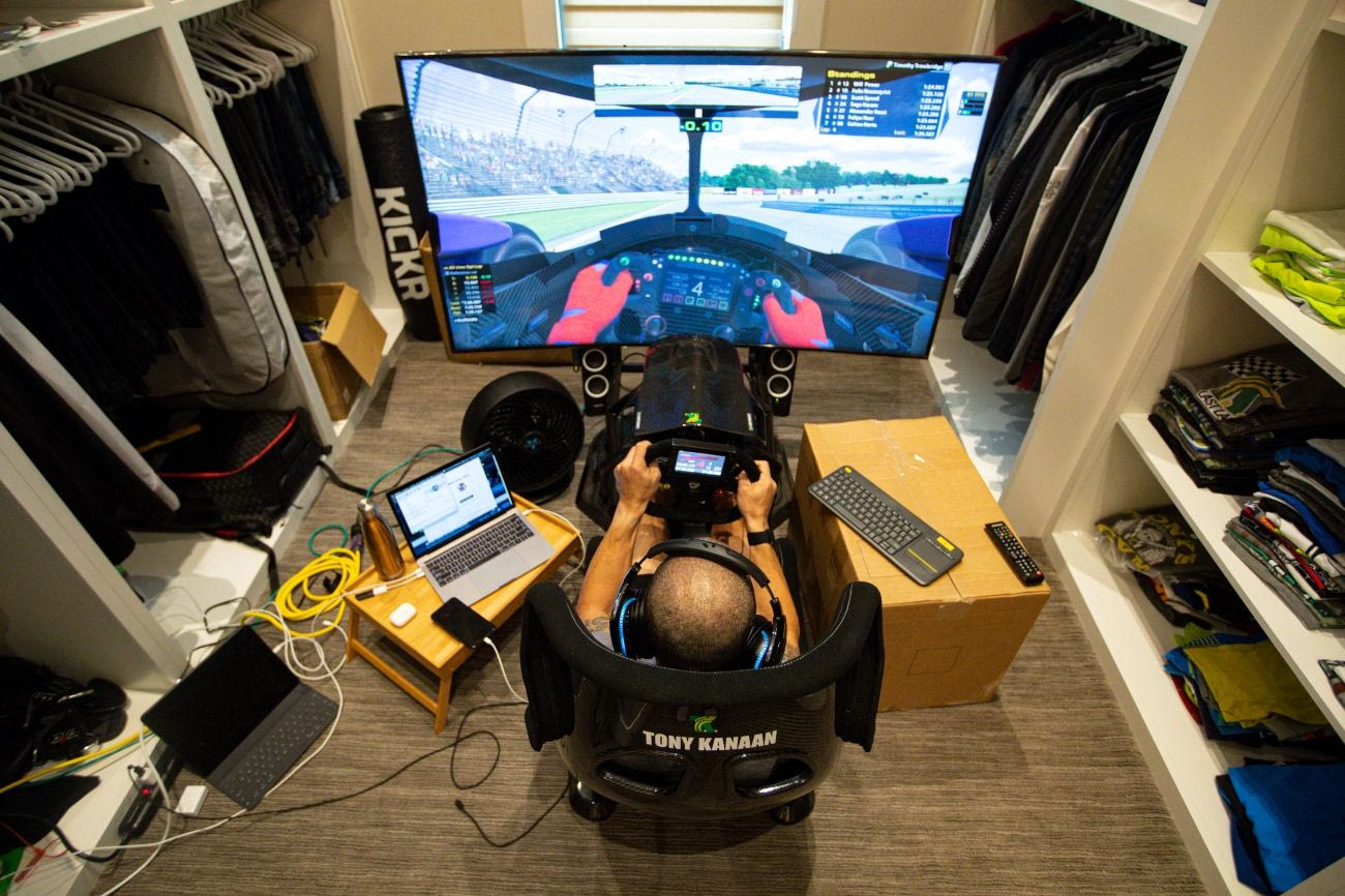 Ο Βραζιλιάνος οδηγός αγωνιστικών αυτοκινήτων Τόνι Κανάαν κάνει εξάσκηση στον προσομοιωτή αγώνων του σπιτιού του, στην Ινδιανάπολη AP Photo/Michael Conroy