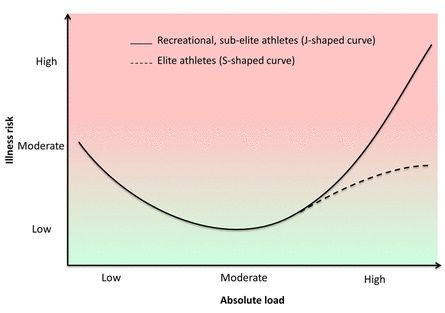 “Πρόσφατα εκτιμήθηκε ότι η σχήματος J καμπύλη της σχέσης μεταξύ του απόλυτου φορτίου προπόνησης και των ασθενειών δεν αφορούν απαραιτήτως τους κορυφαίους αθλητές. Δεδομένα από έναν αριθμό ερευνών δείχνουν ότι τα πολύ μεγάλα φορτία προπόνησης σε κορυφαίους αθλητές σχετίζονται με μικρότερο ρίσκο ασθένειας σε σχέση με χαμηλότερου επιπέδου αθλητές ή ερασιτέχνες. Οι ακριβείς λόγοι αυτής της παρατήρησης δεν είναι ξεκάθαροι, όμως μια εξήγηση ίσως είναι ότι πρόκειται για αποτέλεσμα ‘αυτο-επιλογής’ και το γεγονός ότι κάποιος είναι κορυφαίος αθλητής σημαίνει ότι διαθέτει εξαιρετική φυσική κατάσταση, που περιλαμβάνει και ένα ανοσοποιητικό σύστημα που υπομένει σε λοιμώξεις, ακόμα και κατά τη διάρκεια τεράστιας φυσικής και ψυχολογικής κόπωσης”.