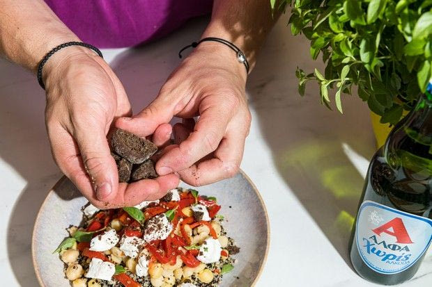 Σαλάτα κινόα με ρεβύθια, παξιμάδι χαρουπιού, πιπεριά Φλωρίνης, φέτα & άγρια ρόκα