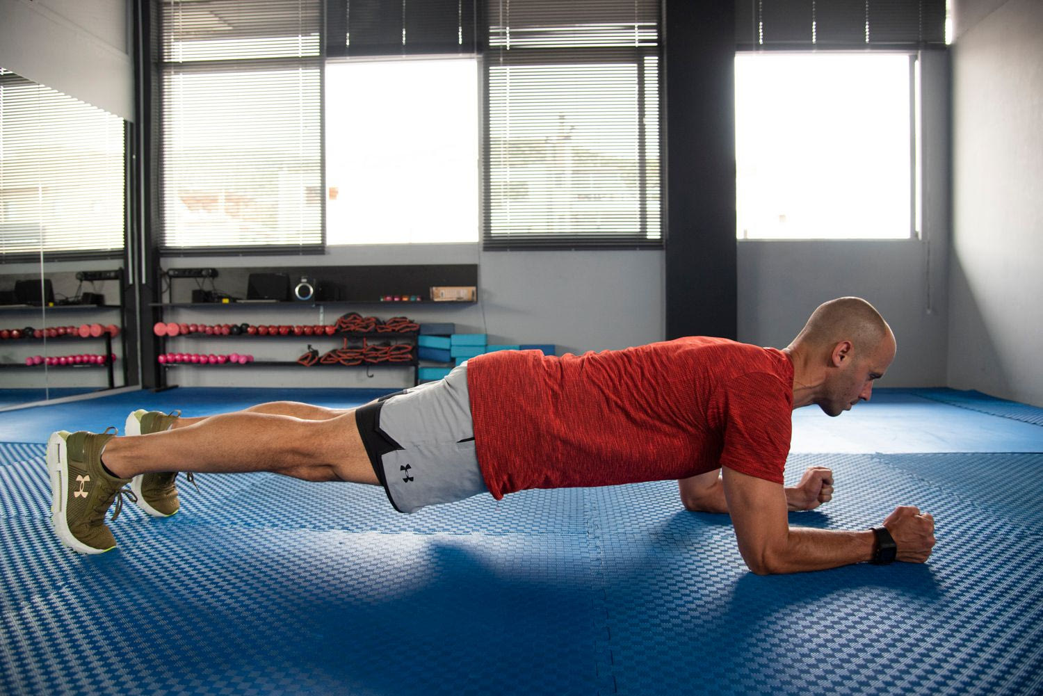 Το πιο τρανταχτό παράδειγμα εκγύμνασης της κοιλιάς χωρίς να κάνεις επαναλήψεις. Λάβε κλασική θέση για κάμψεις αλλά στηρίξου στους αγκώνες με το σώμα παράλληλο στο πάτωμα. Σκοπός είναι, για όσο χρόνο διαρκεί η άσκηση, να σφίγγεις όσο πιο δυνατά μπορείς την κοιλιά σου.