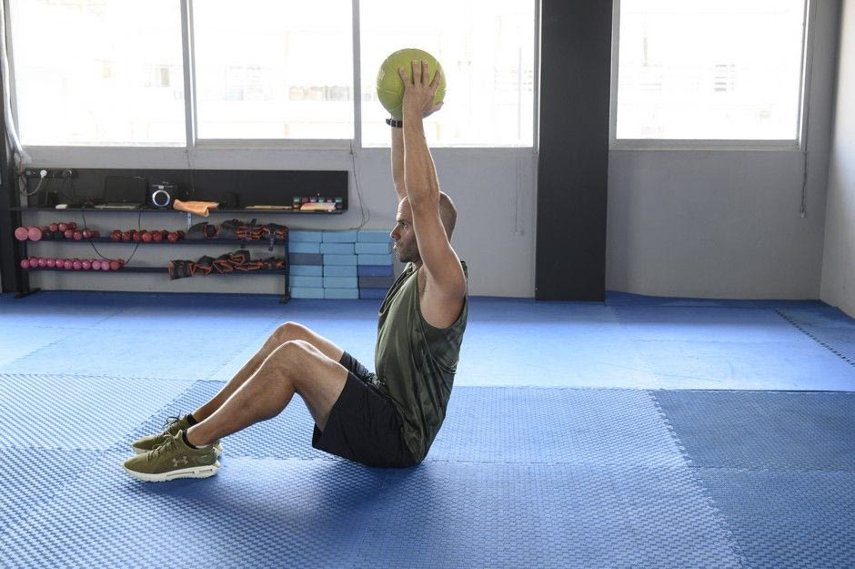 Πάρε θέση για κοιλιακούς κρατώντας με τεντωμένα χέρια την ιατρική μπάλα πάνω από το στήθος. Σήκωσε τον κορμό σου πάνω και συγχρόνως φέρε τα χέρια ψηλά πάνω από το κεφάλι. Τα πόδια παραμένουν λυγισμένα. Χαμήλωσε το σώμα σου κάτω και επανάλαβε.