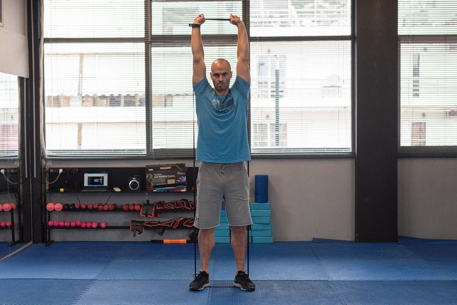 Πέρασε το λάστιχο κάτω από τα λυγισμένα πόδια και πιάσε το άνω μέρος με τα χέρια τα οποία πρέπει να είναι λυγισμένα στο ύψος των ώμων. Με μια κίνηση τέντωσε τα πόδια και τα χέρια ώστε να έρθουν πάνω από το κεφάλι.