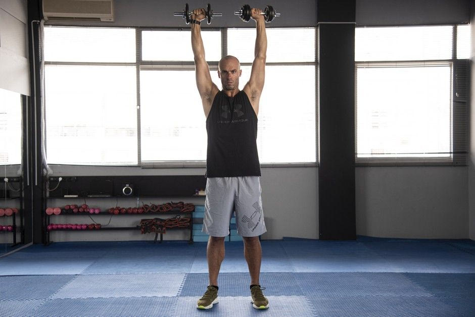 Ίσως η κλασικότερη άσκηση. Γυμνάζει όλη την άρθρωση και είναι η άσκηση που μπορείς να βάλεις πιο πολλά κιλά διότι λειτουργούν όλοι οι μύες της ωμικής ομάδας. Μπορείς να την κάνεις καθιστός αλλά και όρθιος. Πιάσε τους αλτήρες, σήκωσε τα χέρια σου στο ύψος τους κεφαλιού με λυγισμένους αγκώνες και τις παλάμες να κοιτάνε εμπρός. Τέντωσε τα χέρια σου να έρθουν πάνω από το κεφάλι και μετά, επανάφερε τα στην αρχική θέση.