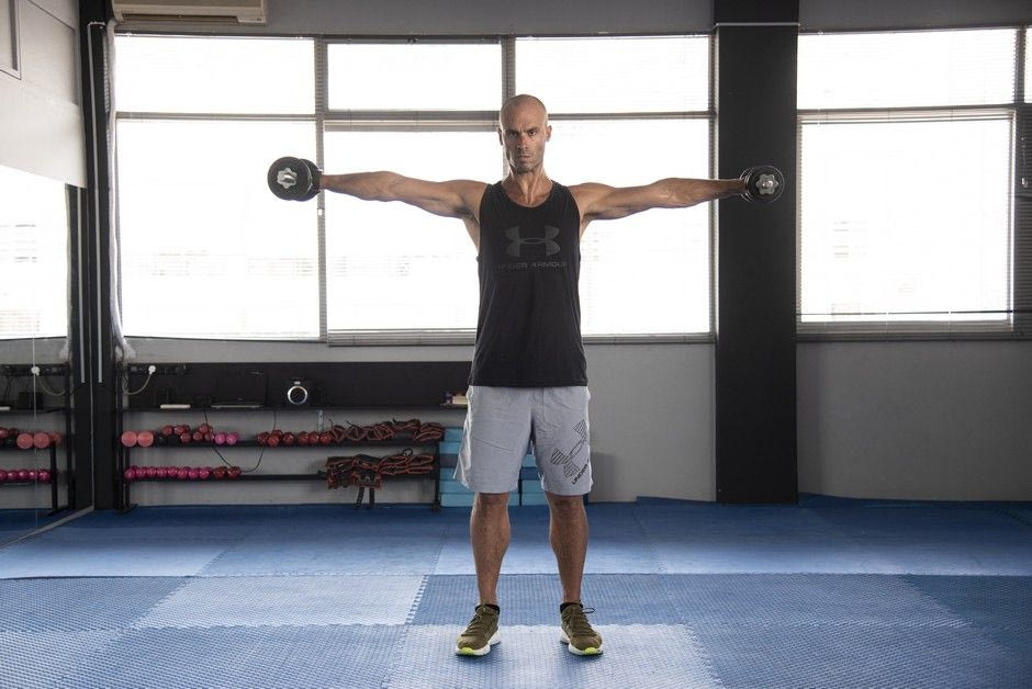 Η άσκηση που εκτός από δύναμη θα δώσει την γράμμωση στους ώμους σου στο σημείο που ενώνονται με τον τρικέφαλο, σχηματίζοντας αυτό το τρίγωνο στο χέρι. Μπορείς να την κάνεις καθιστός αλλά και όρθιος. Έχεις τα χέρια στο πλάι με τις παλάμες να κοιτάνε το σώμα. Σήκωσε τα στο πλάι κάνοντας σταυρό με τις παλάμες να κοιτάνε κάτω, μέχρι το ύψος των ώμων.