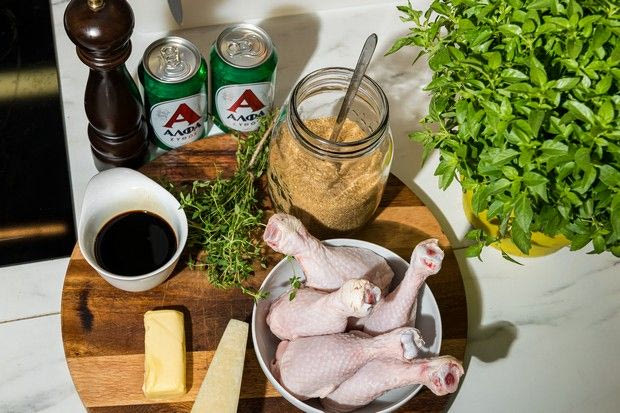 Καραμελωμένα μπουτάκια κοτόπουλου, μαριναρισμένα σε σόγια, μπύρα, καστανή ζάχαρη & φρέσκο θυμάρι