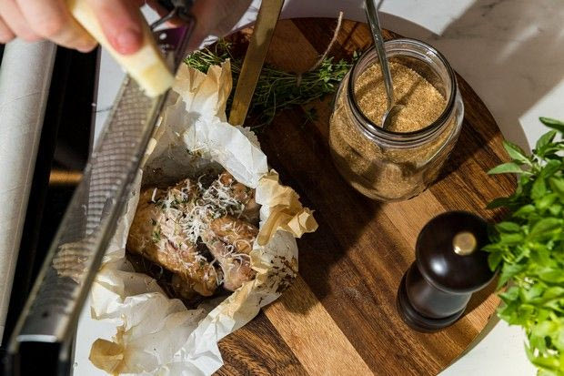Μόλις περάσει ο χρόνος, αποσύρουμε από τον φούρνο, ανοίγουμε με προσοχή τη λαδόκολλα και προσθέτουμε το τριμμένο τυρί.