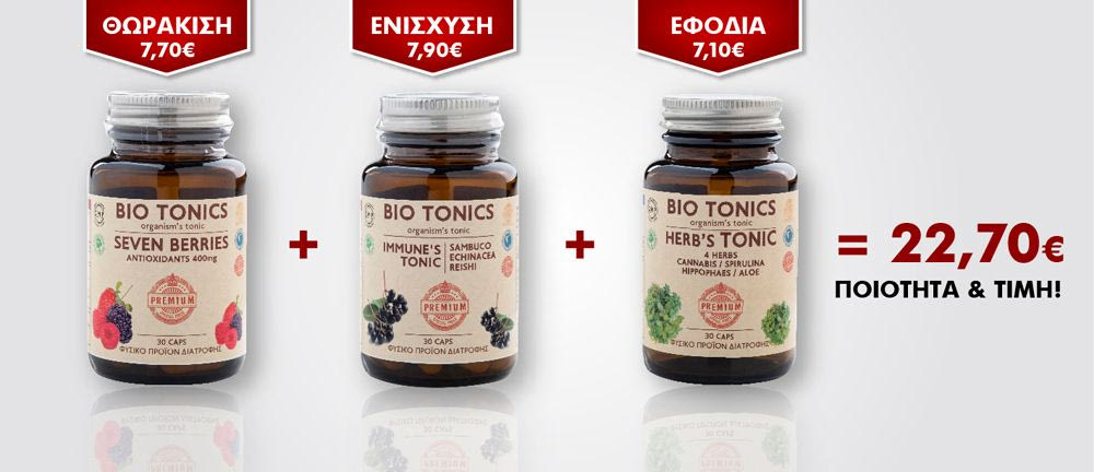 Προμηθευτείτε και τα 3 προϊόντα των BIO TONICS , στην τιμή των μόλις 22,70 ευρώ, αποκλειστικά από τα φαρμακεία της γειτονιάς σας.