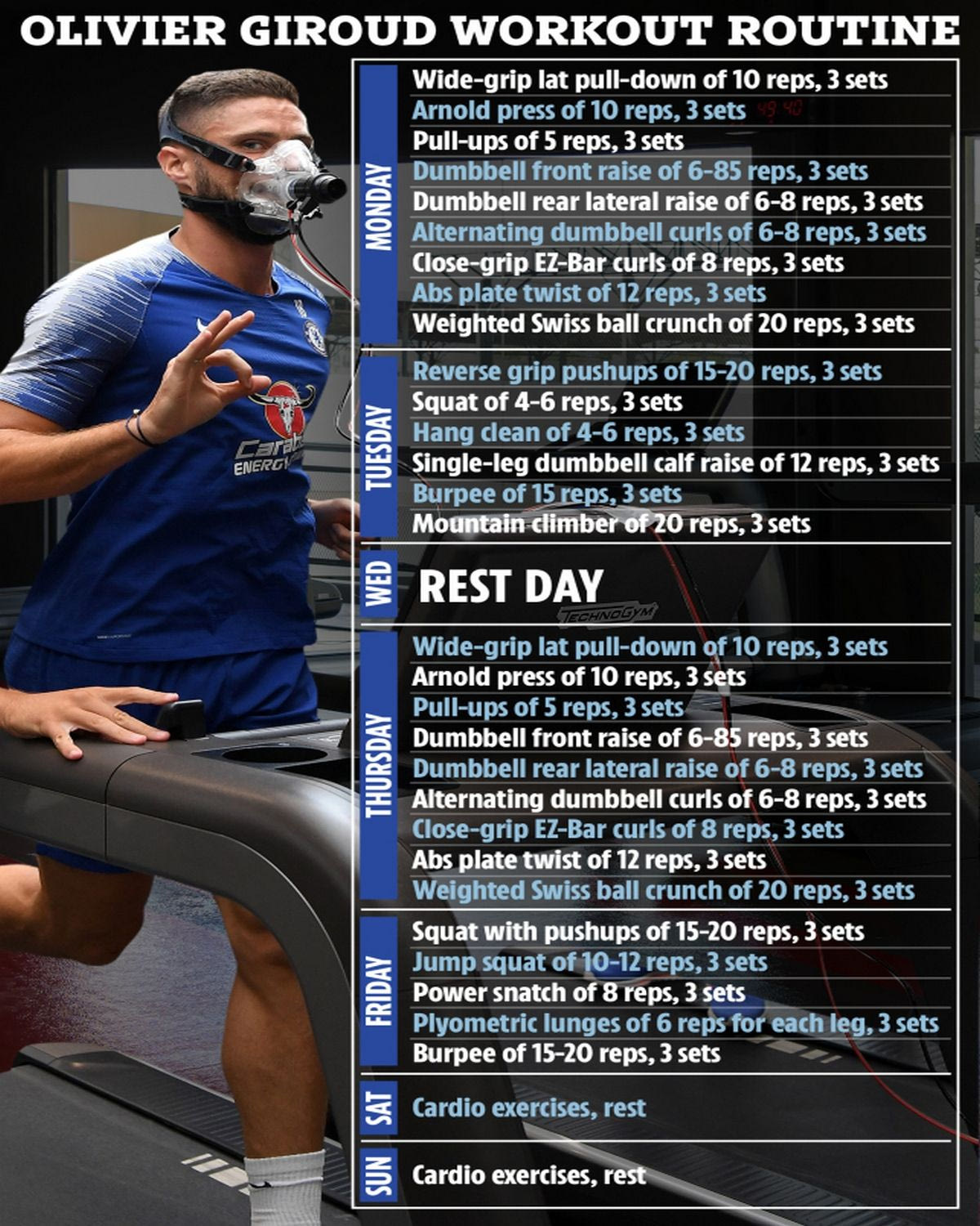 Ξέχωρα από το όποιο προπονητικό πρόγραμμα οφείλει να ακολουθεί με την υπόλοιπη ομάδα, η καθημερινότητα του Ζιρού περιλαμβάνει και έξτρα ατομική προπόνηση. Επιτρέποντας στον εαυτό του μονάχα ένα ρεπό την εβδομάδα, κάθε Τετάρτη. Το πώς μεταφράζεται το ατομικό πρόγραμμα εκγύμνασης του 34χρονου φορ τις υπόλοιπες μέρες, μπορείτε να δείτε στον πίνακα που ακολουθεί.