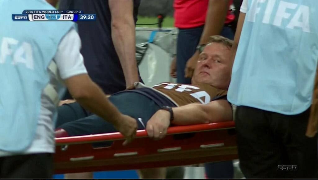 Χρειάζεται να σας θυμίσω πως στο Μουντιάλ της Βραζιλίας η Αγγλία σκόραρε εναντίον της Ιταλίας και στους πανηγυρισμούς για το γκολ ο φυσικοθεραπευτής έσπασε τον αστράγαλο του και αποχώρησε με φορείο χαρίζοντας μας αυτήν το πλάνο-έπος;
