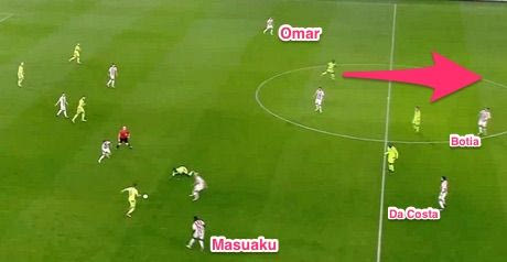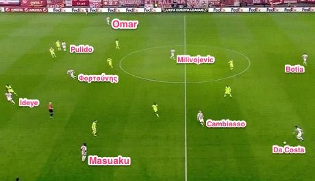 Έκτο λεπτό του αγώνα, ο Ολυμπιακός χτίζει επίθεση και η μπάλα είναι στα πόδια του Ντα Κόστα αριστερά. Κοιτάξτε που βρίσκονται οι παίκτες των ερυθρόλευκων. Ο Ομάρ είναι τέρμα πάνω στα δεξιά, ως εξτρέμ, ο Μαζουακού κι αυτός πάνω απ’τη σέντρα. Ο Πουλίδο είναι φορ στο ύψος του Ιντέγε, ο Φορτούνης πίσω τους. Καμπιάσο-Μιλιόγεβιτς είναι στη σέντρα, χωρίς κανείς τους να έχει “πέσει” χαμηλά ώστε να κάνει τριάδα με τους στόπερ και να “ανοίξουν” στο γήπεδο για να προσφέρουν σχετική ασφάλεια. Δεύτερη εικόνα: