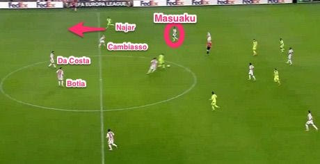 Δεύτερο ημίχρονο, ο Ολυμπιακός επιτίθεται από αριστερά, ο Μαζουακού κάνει τον εξτρέμ. Οι Άντερλεχτ κερδίζει και ο Οκάκα έρχεται στο κέντρο για να υποδεχθεί με πλάτη. Κοιτάξτε που βρίσκεται ο Μαζουακού που περπατάει την ώρα που ο Ναχάρ (ο δεξιός μπακ και όχι εξτρέμ) τρέχει το γήπεδο για να βγει τετ-α-τετ και να έχει δοκάρι.