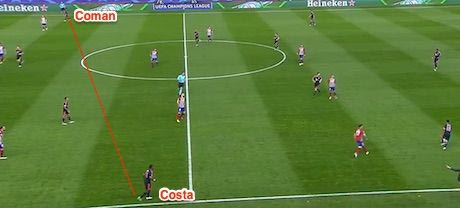 Το πλάνο έλεγε πως Κόστα και Κομάν θα έπαιζαν πολύ κοντά στις γραμμές, όσο πιο πλάι γίνεται, για να αναγκάσουν την Ατλέτι να “ανοίξει” πολύ. Βιδάλ και Τιάγο θα έπαιζαν κι αυτοί κοντά στους εξτρέμ, ώστε μαζί με τους μπακ να φτιάξουν τριάδες που θα δημιουργήσουν ρήγματα στο πλάι. Ο Γκουαρδιόλα δεν ήθελε να παίξει κατά μέτωπο και κάθετα, ήθελε να φύγει απ’ τον χώρο του Γκάμπι και να πάει στα άκρα.
