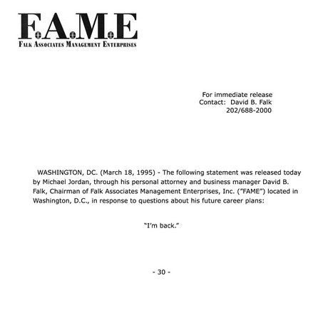 Η αυτού εξοχότης δεν θέλησε να κάνει κάποια δακρύβρεχτη και μακροσκελή ανακοίνωση. Ενημέρωσε το γραφείο που είχε τα δικαιώματά του και εκείνο απέστειλε σ’ όλα τα ΜΜΕ των ΗΠΑ το δελτίο τύπου των… δύο λέξεων! Ο Τζόρνταν ήταν και πάλι μέλος των Μπουλς και του ΝΒΑ.