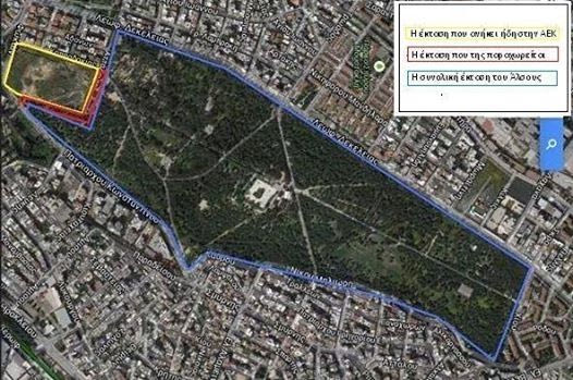 Υ.Γ.: Στη φωτογραφία, στο κίτρινο πλαίσιο φαίνεται το οικόπεδο της ΑΕΚ. Στο κόκκινο η έκταση που διεκδικεί η ΑΕΚ με την αποψίλωση 52 δέντρων και την αντικατάστασή τους από 5.000 δέντρα και θάμνους στα φαλακρά σημεία του υπόλοιπου δάσους.