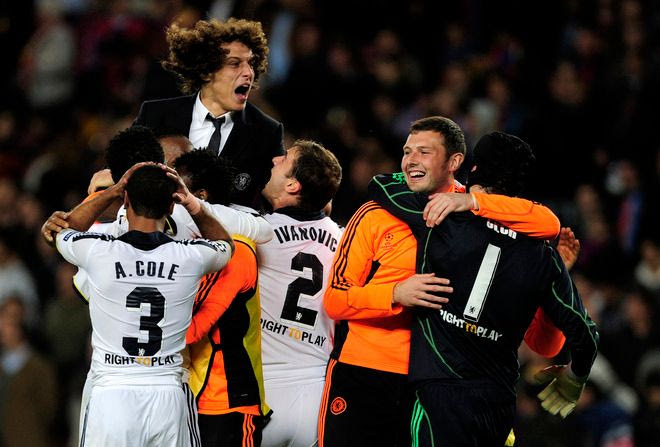 Members of the Chelsea squad celebrate after beating Barcelona in the UEFA Champions League second leg semi-final football match Barcelona against Chelsea at the Cam Nou stadium in Barcelona on April 24, 2012. AFP PHOTO / JOSEP LAGO (Photo credit should read JOSEP LAGO/AFP/Getty Images) AFP/Getty Images
