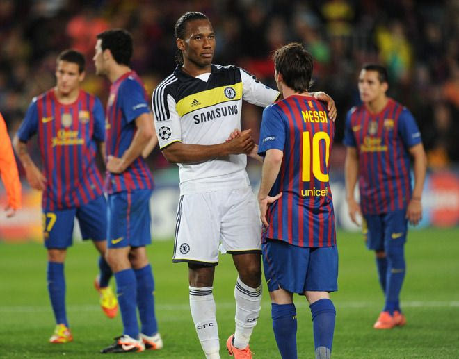 Chelsea's Ivorian forward Didier Drogba (L) shakes hands with Barcelona's Argentinian forward Lionel Messi (R) after the UEFA Champions League second leg semi-final football match Barcelona against Chelsea at the Cam Nou stadium in Barcelona on April 24, 2012. Ten-man Chelsea reached the Champions League final after drawing 2-2 with holders Barcelona in their semi-final final second leg clash here to progress 3-2 on aggregate. AFP PHOTO / LLUIS GENE (Photo credit should read LLUIS GENE/AFP/Getty Images) AFP/Getty Images