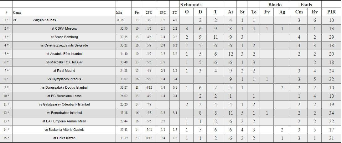 Γιατί πολλές φορές δεν χρειάζεται και μεγάλη ανάλυση για να αποδείξεις τα αυτονόητα, σας το κάνω εύκολο. Δείτε τα στατιστικά του αθλητή που κοροϊδεύετε, όσοι βέβαια το κάνετε. Αυτά είναι τα 15 παιχνίδια του πρώτου γύρου, μέχρι δηλαδή να ντεφορμαριστεί. Νομίζω ότι τα νούμερα που διαβάζεται δεν μπορούν να ανήκουν σε μπασκετομπολίστα που να αμείβεται φθηνά.