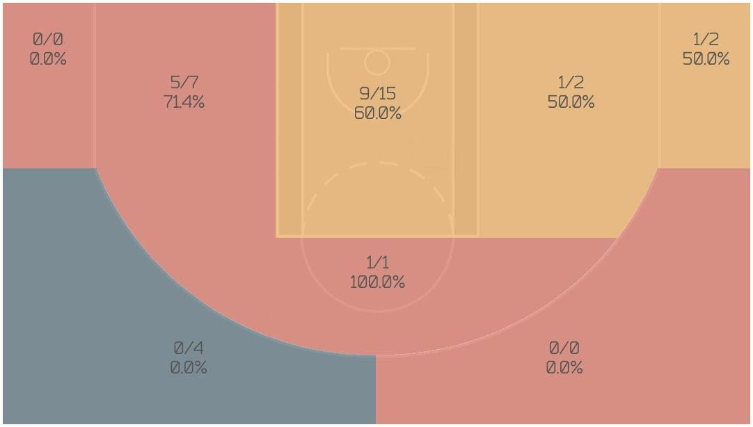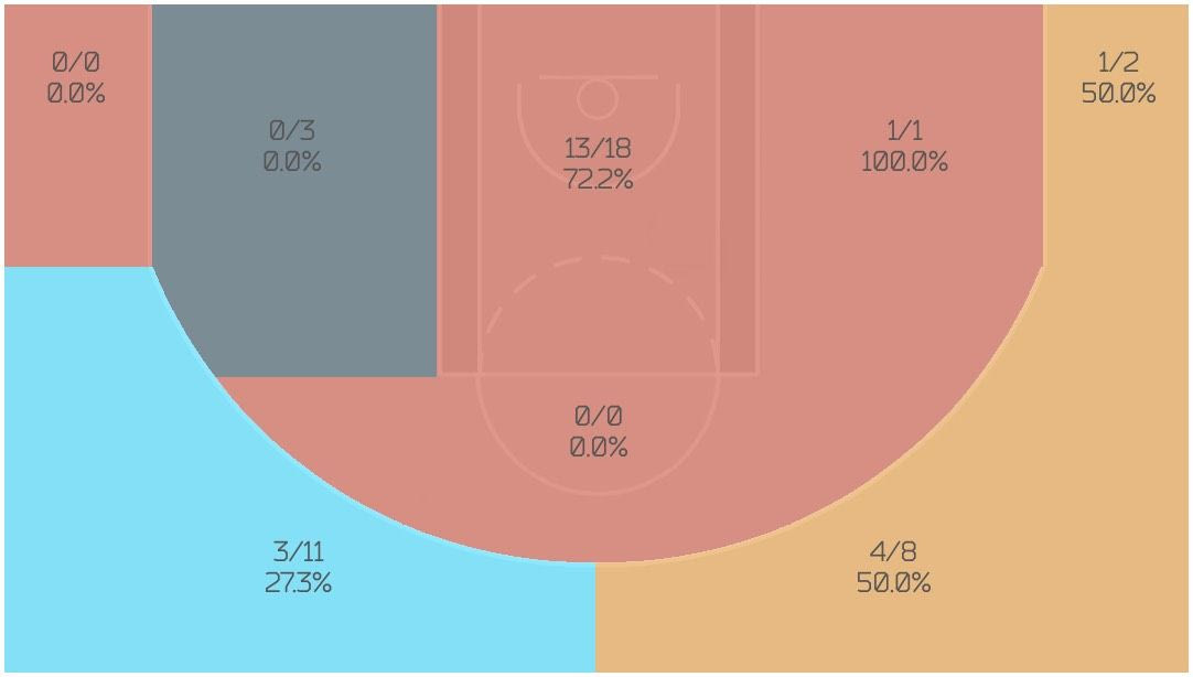 Οι ερυθρόλευκοι, θα μπουν στον τέταρτο τελικό, χωρίς τον καλύτερό τους ψηλό ο οποίος στους 2 πρώτους αγώνες, πήρε το 80% των ποσταρισμάτων της ομάδας του. Ο Πρίντεζης όπως θα δείτε και στο γράφημα έχει το εντυπωσιακό 64% ποσοστό στα δίποντα με 16/25 σουτ. Από τα χέρια του Πρίντεζη περνά το 35% των επιθέσεων μέσα από την γραμμή των τριών πόντων. Το γεγονός πως στους τελικούς ο Πρίντεζης έχει πάρει λίγα μακρινά σουτ, υποδηλώνει την σχετική άνεση με την οποία λειτουργούσε κοντά στο καλάθι.