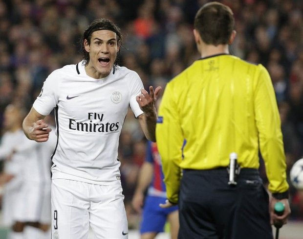 PSG's Edinson Cavani argues with the fourth referee during the Champion's League round of 16, second leg soccer match between FC Barcelona and Paris Saint Germain at the Camp Nou stadium in Barcelona, Spain, Wednesday March 8, 2017. (AP Photo/Emilio Morenatti) AP