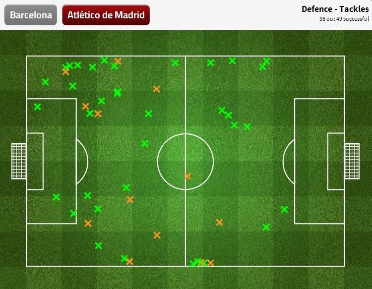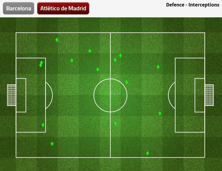 Όπως προκύπτει από τα στατιστικά και τα γραφήματα, η Ατλέτικο με κατοχή μπάλας 35,8% (και δίχως δύο σημαντικά γρανάζια της μηχανής της από το 24′) έπαιζε άμυνα σε πολύ μεγαλύτερο χώρο από το 1/3 του γηπέδου, ως είθισται με τις ομάδες που στήνουν… λεωφορείο μπροστά από τον τερματοφύλακά τους. Ανά διαστήματα, μάλιστα, είχε τον απόλυτο έλεγχο του αγώνα και δη μετά από το 75′ και την πίεση των γηπεδούχων (το διάστημα του γκολ οφσάιντ του Λιονέλ Μέσι), που για ένα 5λεπτο πίεζε κυριολεκτικά σε όλο το γήπεδο, μέχρι και εντός της περιοχής του Σέρχιο Πίντο!