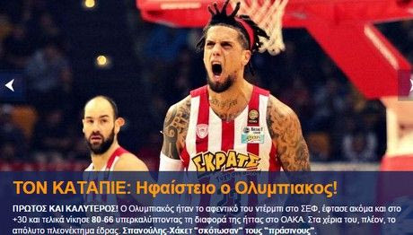Από τη μία σαφώς και το θριαμβευτικό 80-66 του Ολυμπιακού επί του Παναθηναϊκού, στην τρίτη εφετινή μονομαχία τους, απέδωσε τα του Καίσαρος τω Καίσαρι, αποτύπωσε με ακρίβεια την εικόνα ενός αγώνα που κρίθηκε πολύ νωρίς. Από την επίθεση που ο Βασίλης Σπανούλης σηκώθηκε πίσω από το σκριν του Χάντερ για τρεις και βρήκε στόχο διαμορφώνοντας το 7-4, οι πρωταθλητές ήταν απολαυστικοί. Ισοπέδωσαν το μεγάλο αντίπαλό τους και -όπως παραστατικά αποτυπώθηκε στον κεντρικό τίτλο του Contra.gr- τον κατάπιαν.