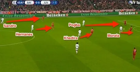 Μόλις τέταρτο λεπτό του αγώνα και όλοι οι παίκτες μπροστά απ’ την άμυνα της Γιουβέντους είναι πάνω απ’ τη σέντρα και πιέζουν. Ο Μοράτα πάνω στον Μπενατιά, ο Πογκμπά ακολουθεί την πάσα και τρέχει στον Κίμιχ, αλλά το σημαντικό γίνεται πίσω τους. Ο Κεντίρα γίνεται σκιά του Αλόνσο που τρέχει για να πάρει την μπάλα, ο Ερνάνες “πέφτει” πάνω στον Μίλερ που έχει κατέβει χαμηλά, ο Σάντρο εφορμά στον Λαμ στη γραμμή. Ορίστε.