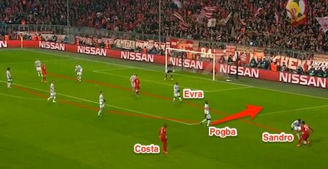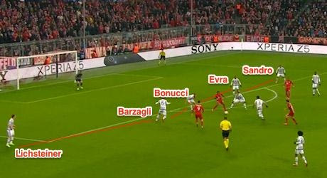 Στην πράξη όμως αμύνονταν με ένα 5-4-1, χάρις σ’ ένα τρικ στα αριστερά τους. Ο Εβρά έκλεινε προς τα μέσα και γινόταν στόπερ δίπλα στους Μπονούτσι-Μπαρζάλι, ο Σάντρο έβγαινε στο πλάι ως αριστερός μπακ και μπροστά του είχε σωματοφύλακα τον Πογκμπά. Ο Σάντρο ήταν τυπικά μέσος, αλλά στην ουσία πέρασε το μεγαλύτερο διάστημα του αγώνα ως αριστερός μπακ, με τον Εβρά κεντρικά, κοντά στους στόπερ. Ιδού.