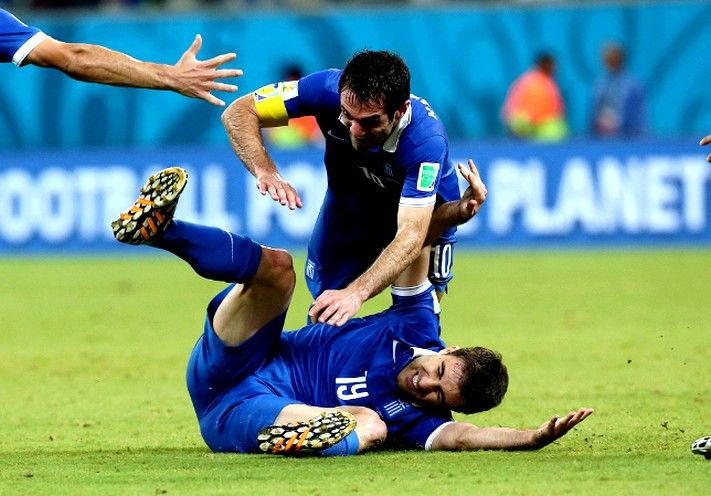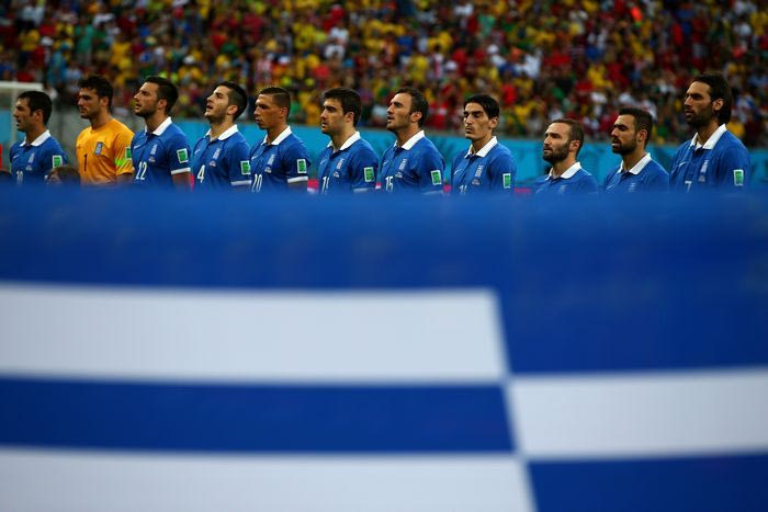 RECIFE, BRAZIL - JUNE 29: Greece players line up for the national anthems prior to the 2014 FIFA World Cup Brazil Round of 16 match between Costa Rica and Greece at Arena Pernambuco on June 29, 2014 in Recife, Brazil. (Photo by Alex Grimm - FIFA/FIFA via Getty Images) FIFA via Getty Images