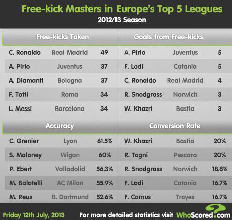 Το conversion rate 11,9% μοιάζει ικανοποιητικό, αν και μία άλλη συγκεντρωτική ανάλυση του “Who Scored” για τη σεζόν 2012-2013 στα 5 μεγάλα πρωταθλήματα δείχνει ότι απέχει παρασάγγας από τις καλύτερες επιδόσεις. Αντιστοίχως, στον πίνακα φαίνονται και τα υψηλότερα ποσοστά ευστοχίας των εκτελέσεων, στατιστικό το οποίο επίσης συντελεί στη συρρίκνωση του μύθου του “σπεσιαλίστα” των φάουλ, Ρονάλντο.