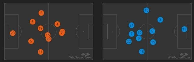 Δείτε τον πίνακα με το που έκαναν οι παίκτες των δύο ομάδων τα περισσότερα πατήματα στον αγώνα. Πίνακας που δείχνει και την πραγματική τακτική που ακολούθησαν οι δύο προπονητές.