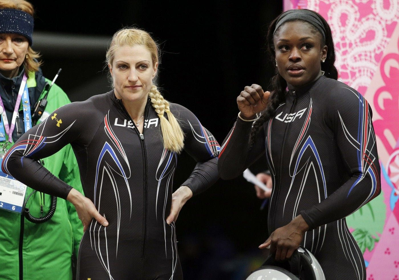 The team from the United States USA-2, piloted by Jamie Greubel, left, with brakeman Aja Evans, react after their third run during the women's bobsled competition at the 2014 Winter Olympics, Wednesday, Feb. 19, 2014, in Krasnaya Polyana, Russia. (AP Photo/Jae C. Hong) AP