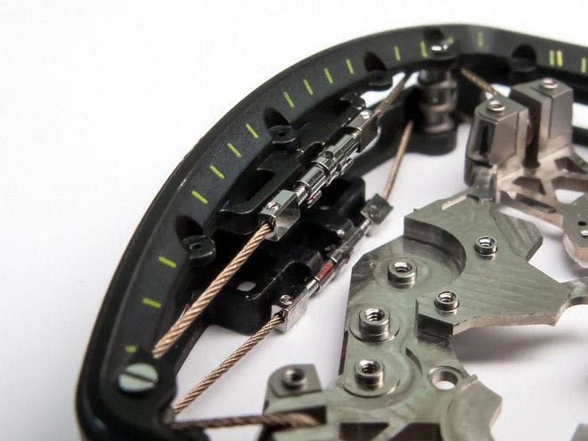 Η βάση του RM27-01 συνδυάζει ισχύ με ελαστικότητα για να προστατεύει την κίνηση και ζυγίζει μόλις 3,5 γραμμάρια. Το τιτάνιο 5ου βαθμού για τη βάση και τα γρανάζια εγγυώνται μακρόχρονη παρουσία και αντοχή σε επιταχύνσεις άνω των 5.000g, απολύτως χρήσιμο χαρακτηριστικό, όταν ο Ναδάλ κραδαίνει τη ρακέτα του κι ετοιμάζεται για μια δυναμική υποδοχή.