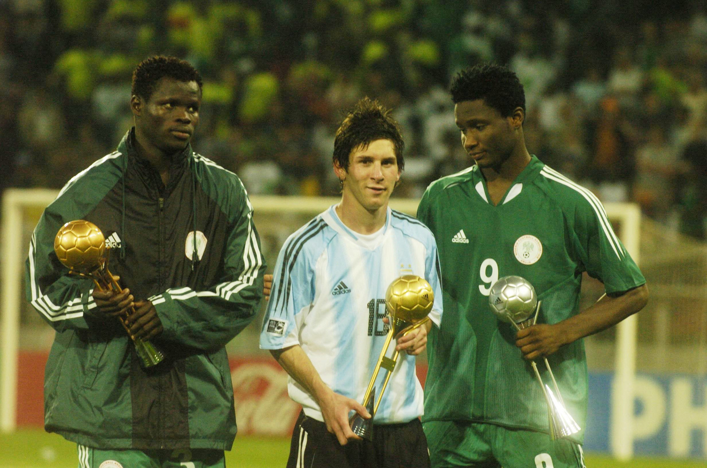 Οι τρεις κορυφαίοι παίκτες του Μουντιάλ Νέων του 2005, όπως ψηφίστηκαν από τους δημοσιογράφους. Από αριστερά: Ταγέ Ταϊβό (Νιγηρία) χάλκινη μπάλα, Λέο Μέσι (Αργεντινή) χρυσή μπάλα και Τζον Όμπι Μίκελ (Νιγηρία) ασημένια μπάλα.