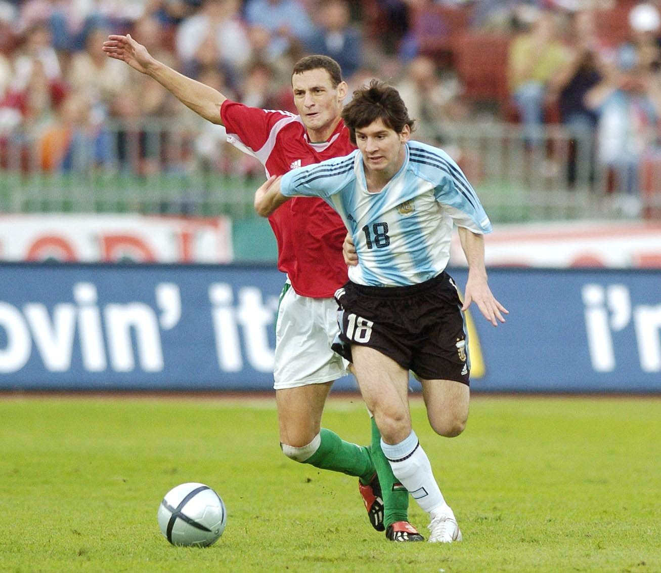 Ολοκληρώνουμε το φωτογραφικό “άλμπουμ” του Μέσι με το ντεμπούτο του στην εθνική Ανδρών, που ήρθε μόλις ενάμισι μήνα μετά την κατάκτηση του Μουντιάλ Νέων. Ο τότε εκλέκτορας της Αργεντινής, Χοσέ Πέκερμαν, κάλεσε τον 18χρονο Λέο για ένα φιλικό με την Ουγγαρία, που διεξήχθη στις 17 Αυγούστου του 2005 στο “Ferenc Puskás Stadium” της Βουδαπέστης. Ο “pulga” μπήκε αλλαγή στο 63′ στη θέση του Λισάντρο Λόπες, αλλά δυο λεπτά αργότερα αποβλήθηκε με απευθείας κόκκινη κάρτα, επειδή ο διαιτητής έκρινε πως ο Αργεντίνος είχε δώσει εσκεμμένα αγκωνιά στον Βίλμος Βαντσάκ, που προηγουμένως τον είχε τραβήξει από τη φανέλα. Στη φωτογραφία βλέπουμε το ξεκίνημα της φάσης, εκεί όπου ο Βαντσάκ έχει αρχίσει το τράβηγμα της φανέλας του Μέσι.
