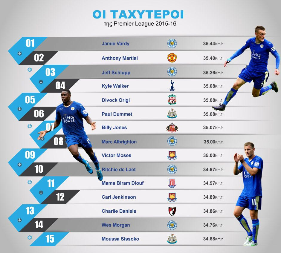 Καμία ομάδα δεν έχει πάνω από δύο, η Λέστερ έχει πέντε. Από μόνο του δεν είναι περίεργο, μπορεί να αποδωθεί σε πολλούς παράγοντες. “Περίεργο” γίνεται αν σκεφτεί κανείς πως και οι πέντε σπρίντερ της Λέστερ έπαιζαν και πέρσι στην Premier League. Και πέρσι, η Λέστερ δεν είχε ούτε έναν παίκτη στην πρώτη 20άδα των πιο γρήγορων σπριντ του πρωταθλήματος.