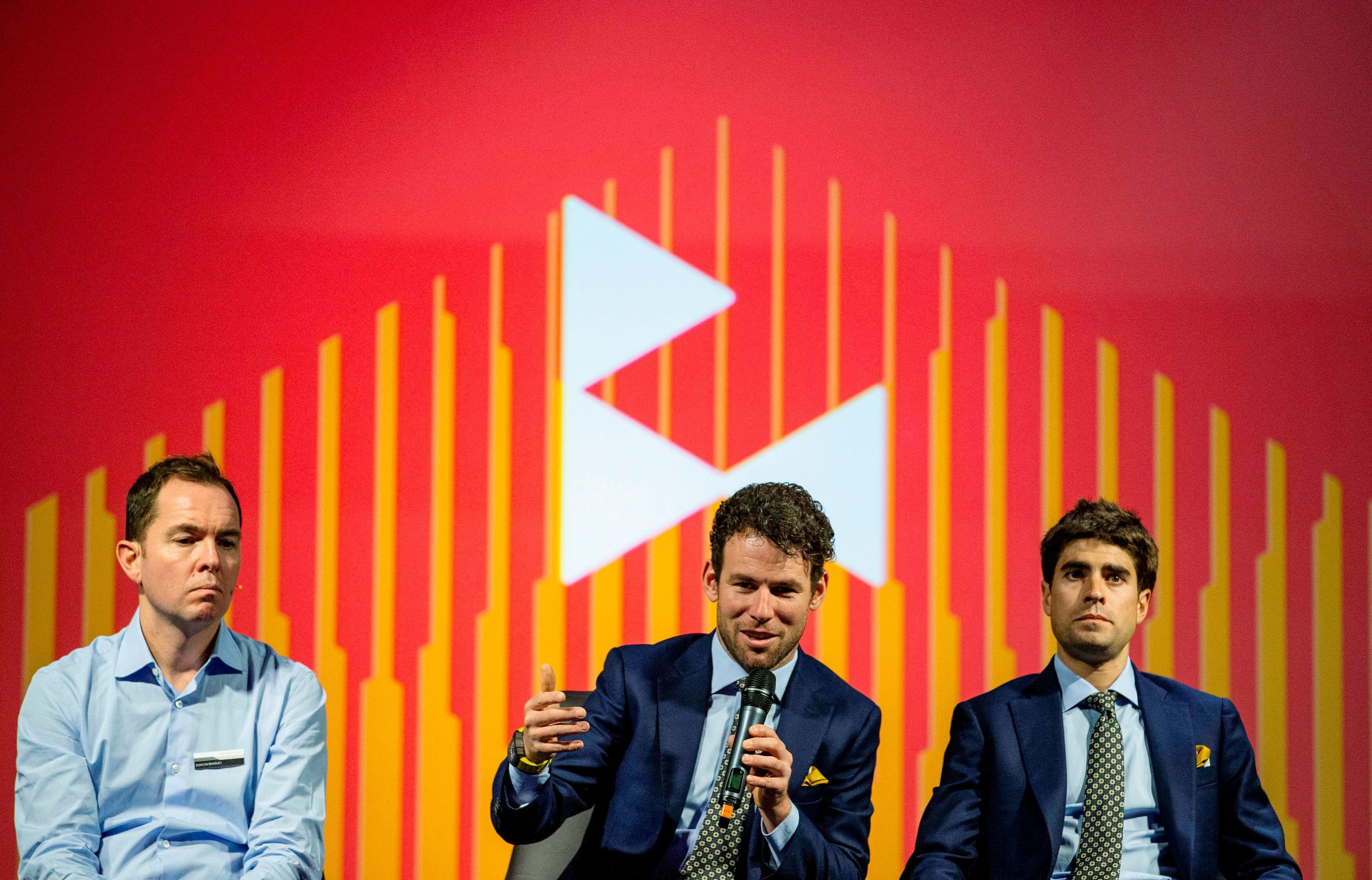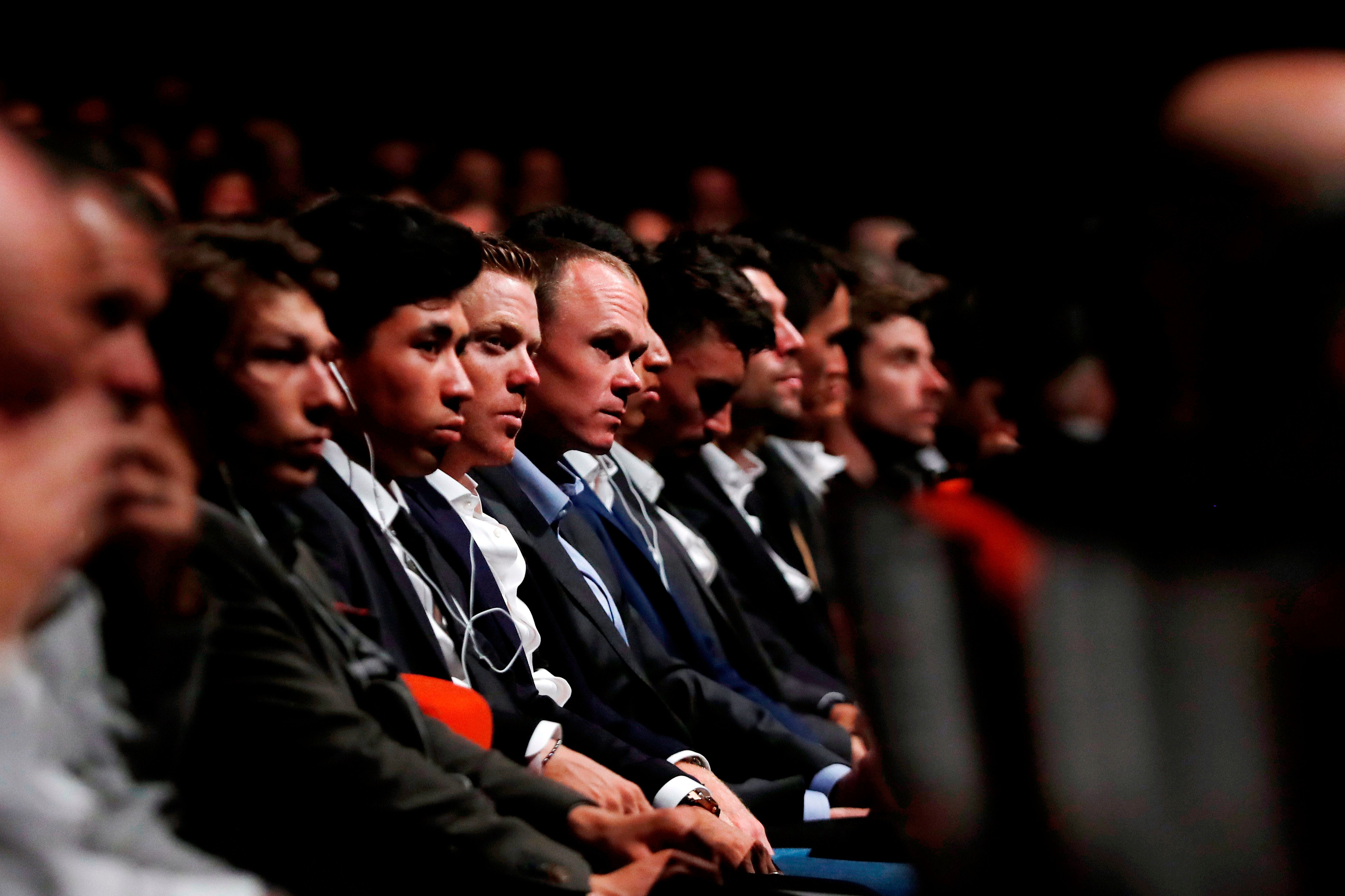 Ο Κρις Φρουμ και άλλοι αθλητές στην παρουσίαση του φετινού Γύρου Γαλλίας (15/10/2019) AP