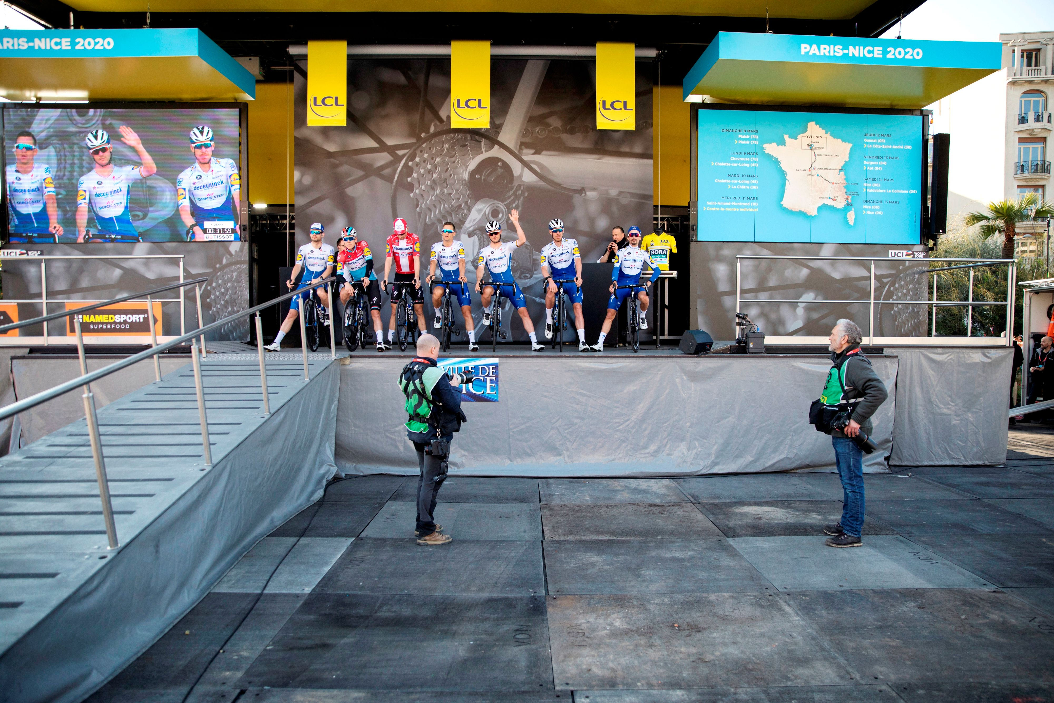 Η παρουσίαση της Deceuninck Quickstep στο φετινό Παρίσι-Νίκαια χωρίς την παρουσία κόσμου. AP