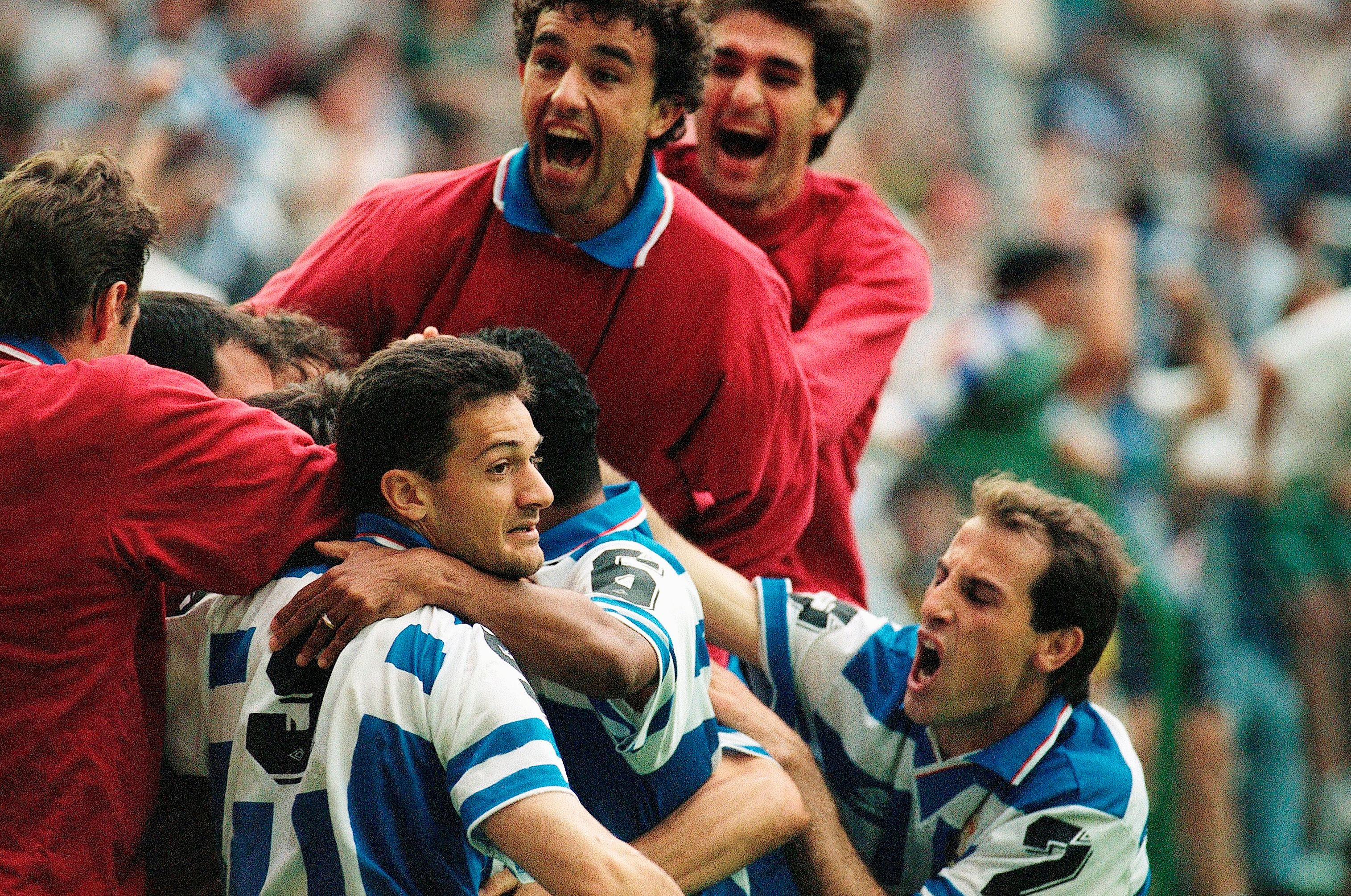 Οι παίκτες της Ντεπορτίβο πανηγυρίζουν την κατάκτηση του Κυπέλλου (27/6/1995) AP
