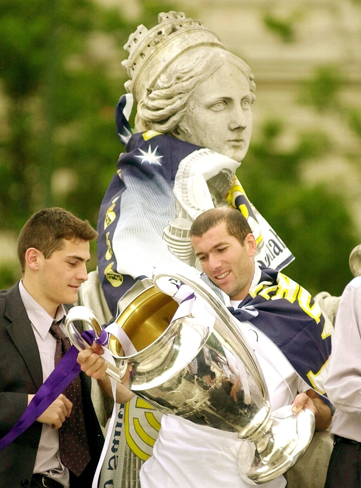 Ο σκόρερ του τελικού, Ζινεντίν Ζιντάν και ο φύλακας άγγελος της εστίας της Ρεάλ στα τελευταία λεπτά, Ίκερ Κασίγιας, με το τρόπαιο του Champions League της σεζόν 2001/02 στην Plaza de Cibeles της Μαδρίτης, γιορτάζοντας τον θρίαμβο της “novena” (16/5/2002).
