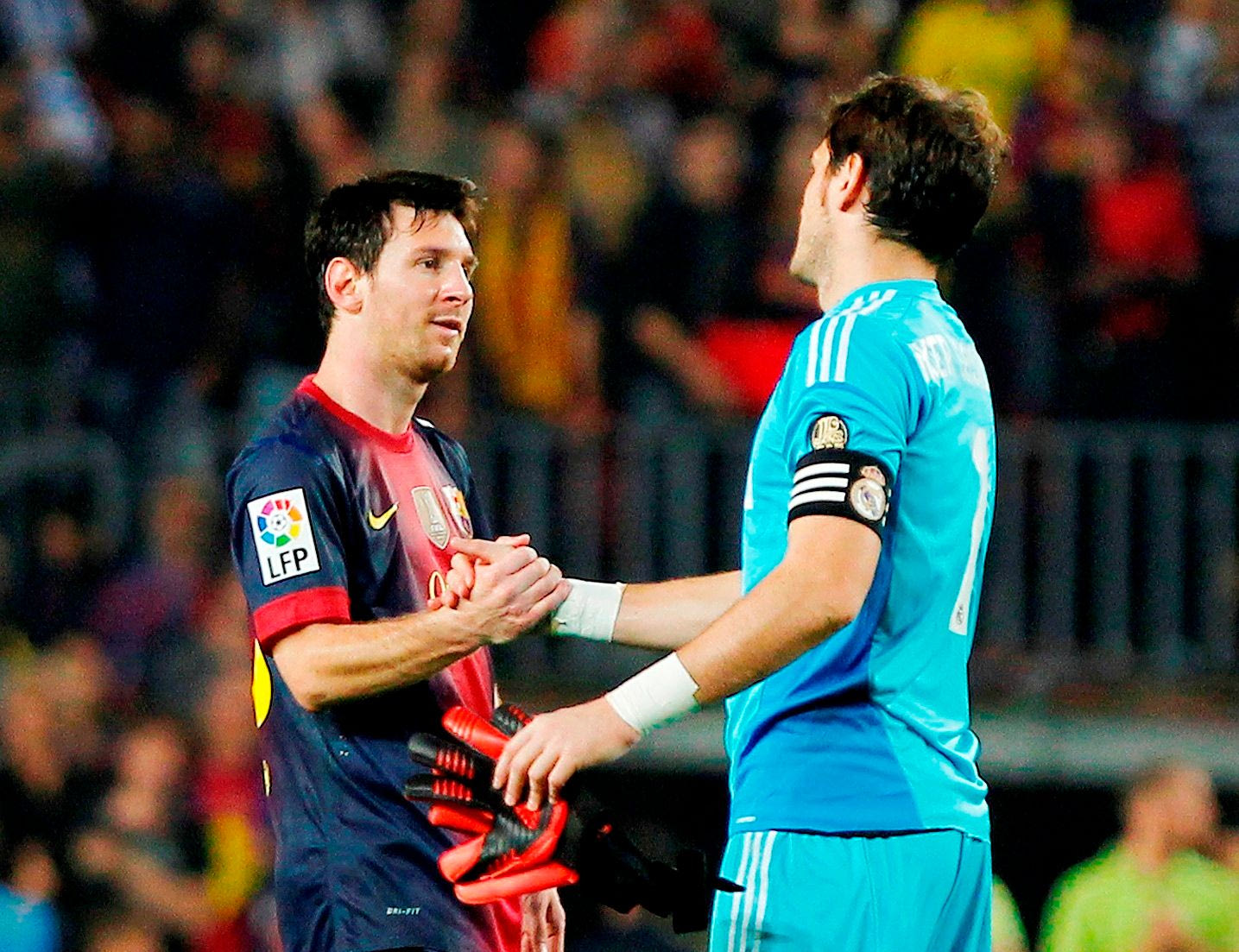 Λιονέλ Μέσι και Ίκερ Κασίγιας δίνουν τα χέρια μετά από clásico της ισπανικής Λίγκας στις 7 Οκτωβρίου του 2012 στο “Καμπ Νόου” (τελικό σκορ 2-2).