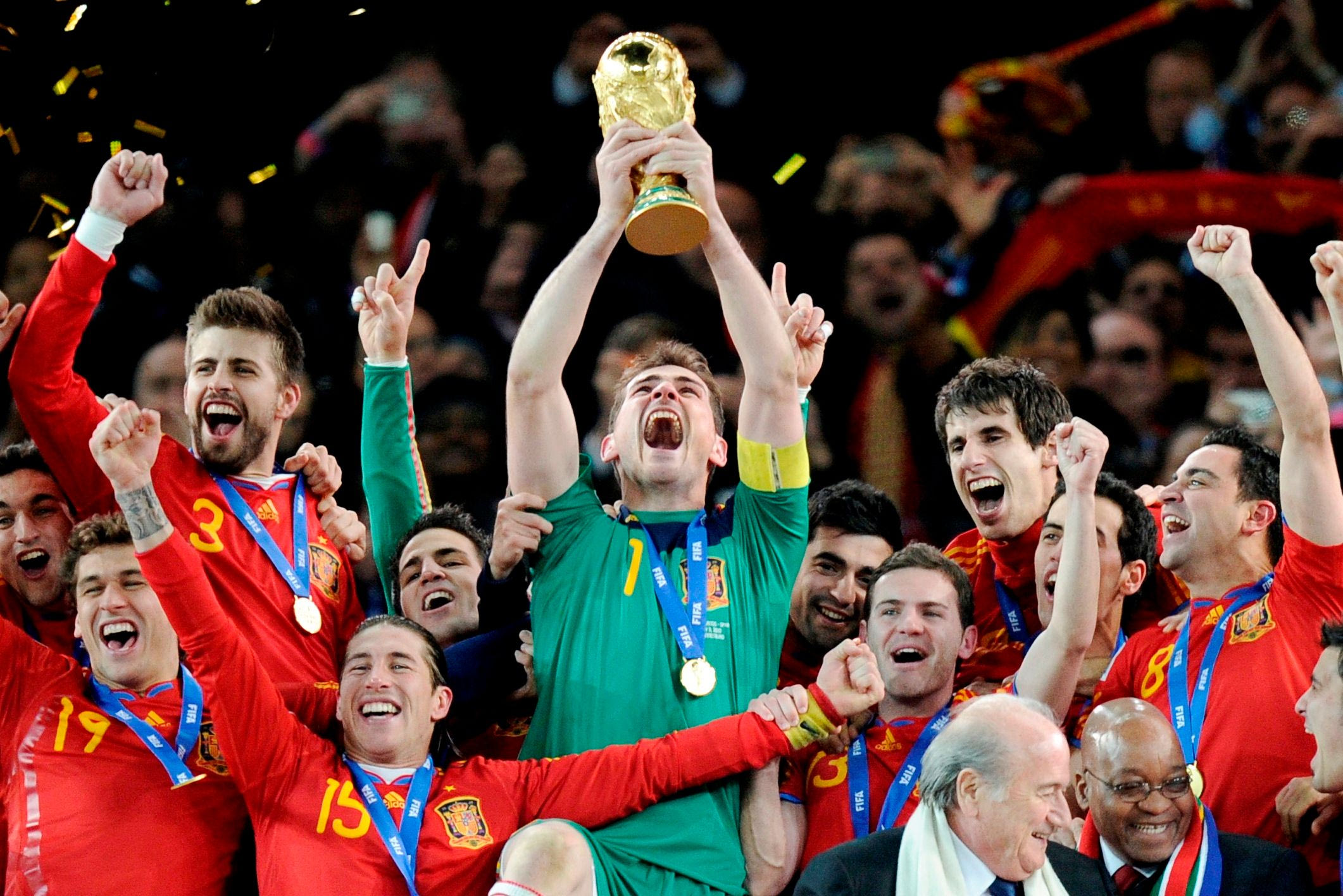 Ο Ίκερ Κασίγιας σηκώνει το Παγκόσμιο Κύπελλο μετά τη νίκη της Εθνικής Ισπανίας με 1-0 επί της Ολλανδίας στον μεγάλο τελικό του Μουντιάλ (11/7/2010).