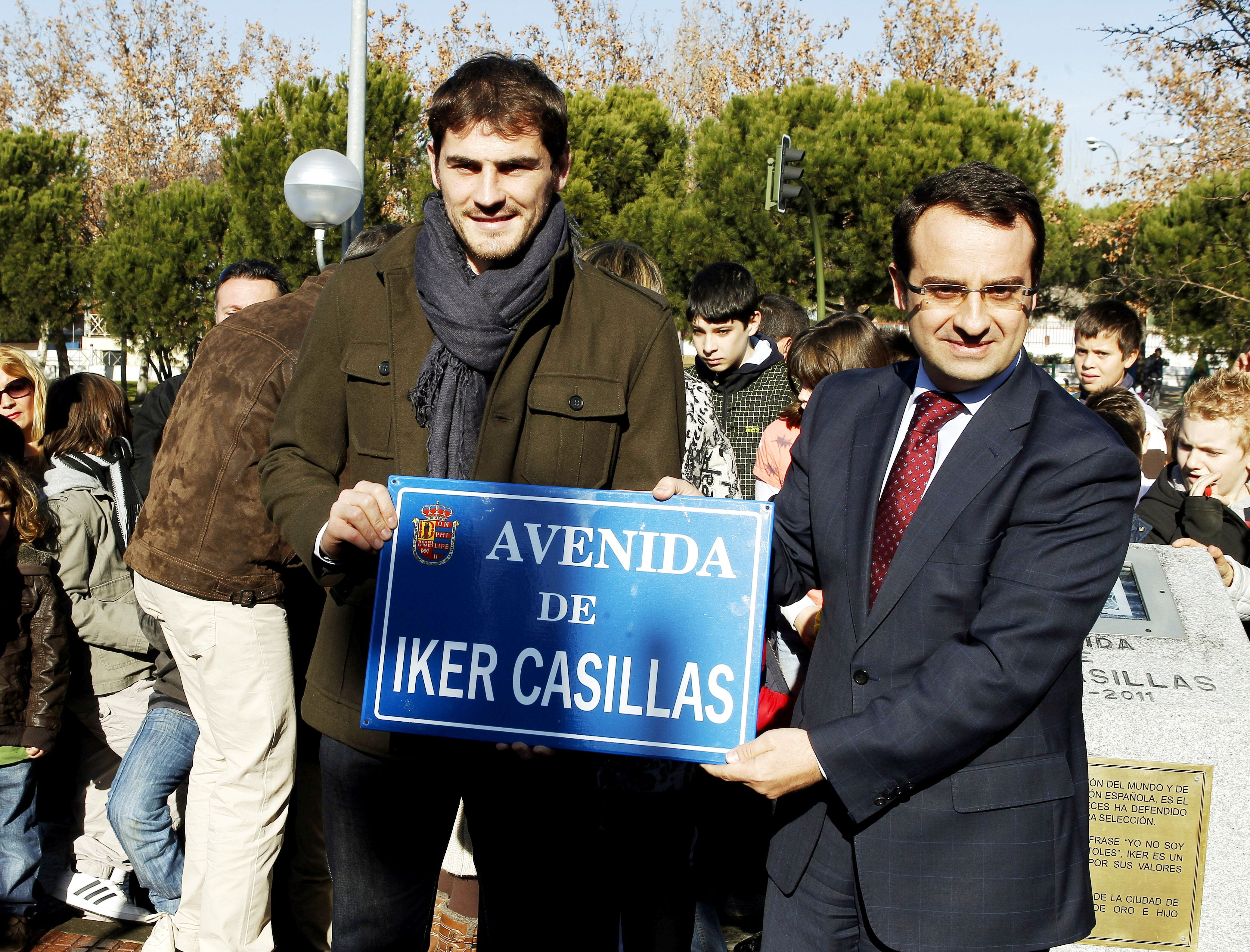 Ο Ίκερ Κασίγιας με τον δήμαρχο του Μόστολες, Ντανιέλ Ορτίθ, στα αποκαλυπτήρια της “Λεωφόρου Ίκερ Κασίγιας” στη γενέτειρα του Ισπανού τερματοφύλακα (5/1/2012).