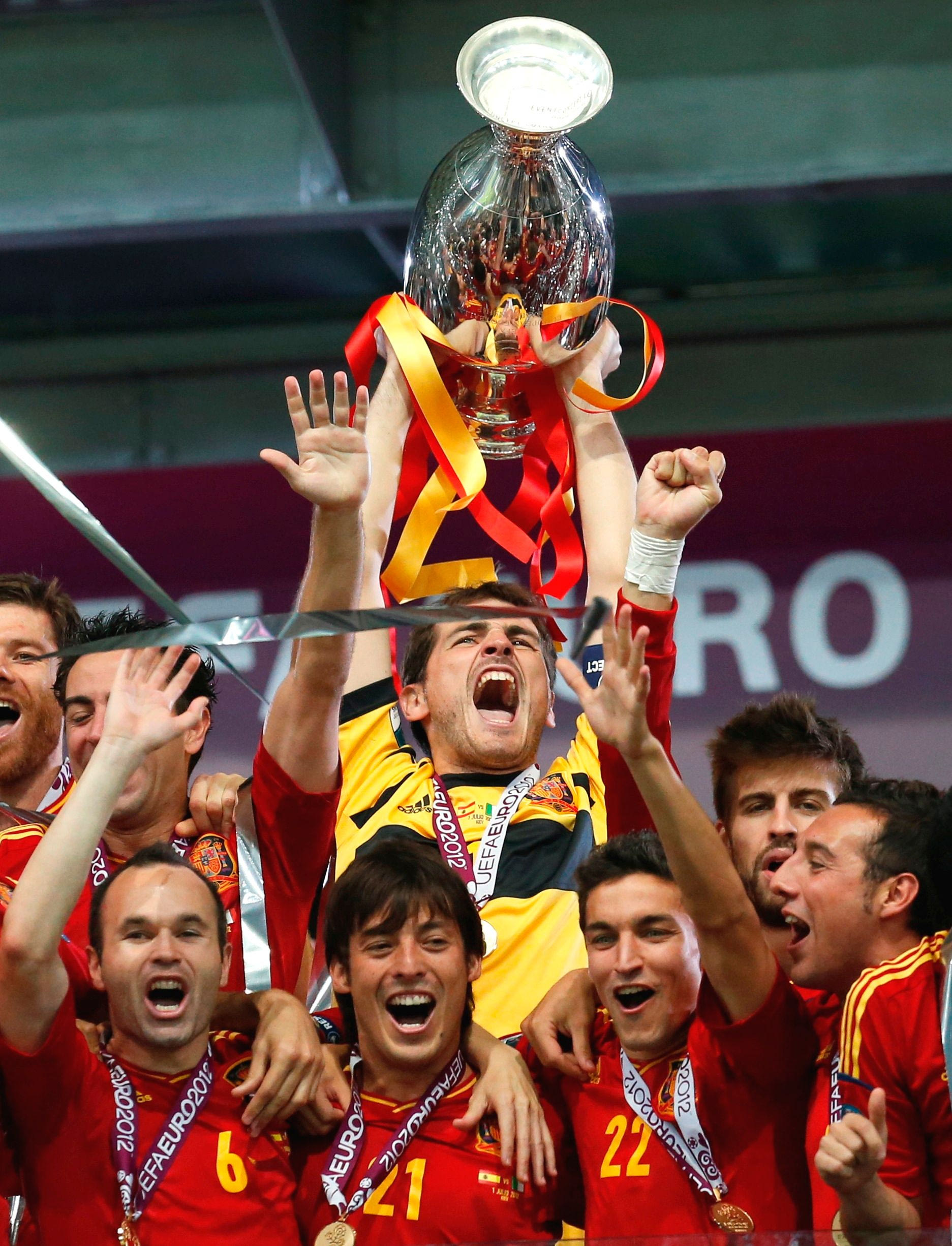 Ο Ίκερ Κασίγιας και οι συμπαίκτες του πανηγυρίζουν την κατάκτηση του EURO 2012, μετά τη νίκη τους με 4-0 επί της Ιταλίας στον τελικό του Κιέβου (1/7/2012).