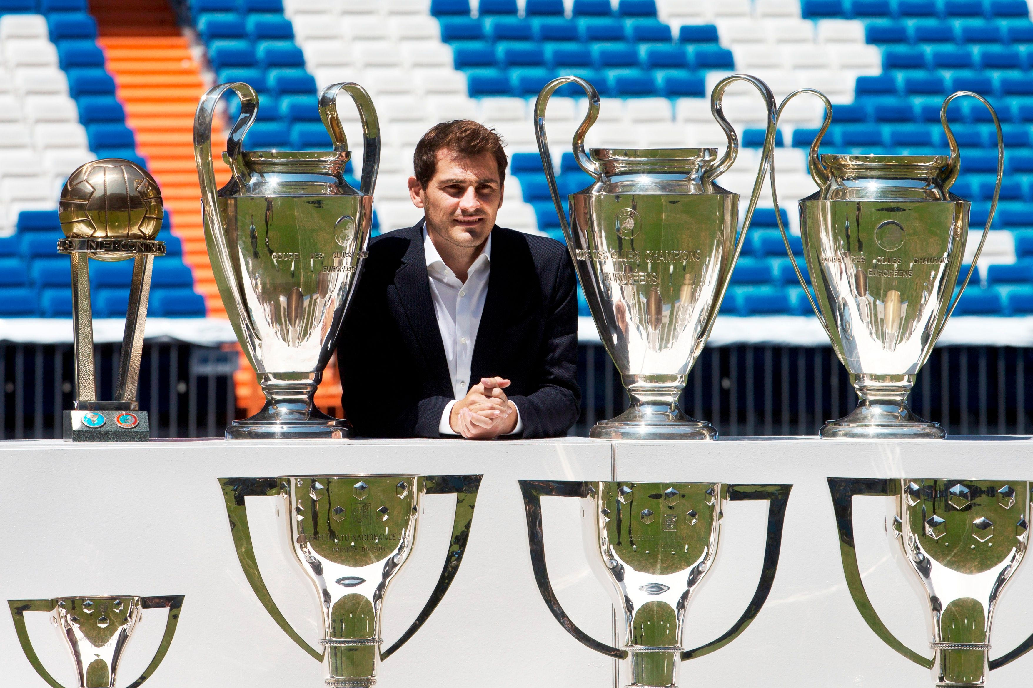 Ο Ίκερ Κασίγιας ποζάρει στον αγωνιστικό χώρο του “Σαντιάγο Μπερναμπέου” με τα 19 τρόπαια που κατέκτησε ως παίκτης της Ρεάλ Μαδρίτης, λίγο μετά την ανακοίνωση της αναχώρησής του από τον μαδριλένικο σύλλογο. Δεσπόζουν φυσικά τα τρία Champions League (13/7/2015).
